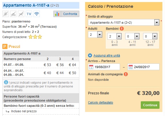 Dopo aver scelto un alloggio e compilato il formulario (può anche mandarci una e-mail), noi le manderemo il calcolo del prezzo definitivo al suo indirizzo e-mail ( controlli le possibilità di prenotazione e la dinamica del pagamento)