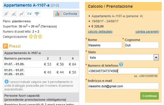 - Nel caso che decida di confermare la prenotazione, il modulo con i Suoi dati sarà inviato al nostro servizio vendite il quale contatterà il proprietario dell'alloggio per la verifica finale della disponibilità dell'alloggio prima di spedirLe il preventivo. Il preventivo sarà inviato al Suo indirizzo e-mail e ci saranno indicate tutte le spese e l'importo dell'acconto il cui pagamento sarà effettuato in congruenza con le modalità e con la dinamica del pagamento riportati sulle nostre pagine.